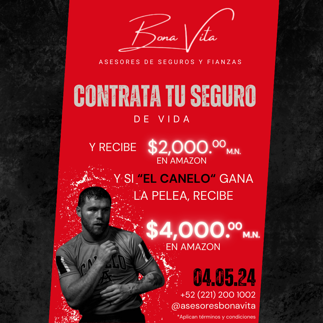 - Si contratas un seguro que participe en la promoción dentro de las fechas establecidas, se te otorgará una tarjeta de regalo con un valor de $2,000.00 pesos mexicanos para ocuparse en AMAZON MEXICO, si Saúl "Canelo" Álvarez llegara a ganar su próxima pelea este 04 de mayo contra Jaime Munguía, tu tarjeta de regalo tendría un valor de $4,000.00 pesos mexicanos ($4,000.00 en total, en lugar de $2,000.00) para AMAZON MEXICO.